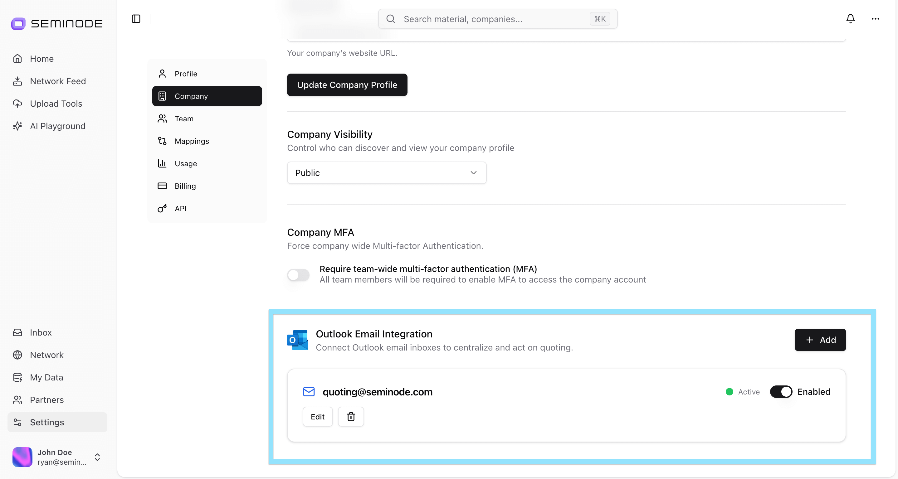 quotes@company.com) via Microsoft Graph to automatically pull quote emails and replies into Seminode to keep full context and move from inbox to insights instantly.The Outlook integration centralizes email threads with partners so your team never loses context or time. Connect a shared or user mailbox and Seminode will ingest relevant conversations, link them to the right partners and parts, and make them actionable in one place.